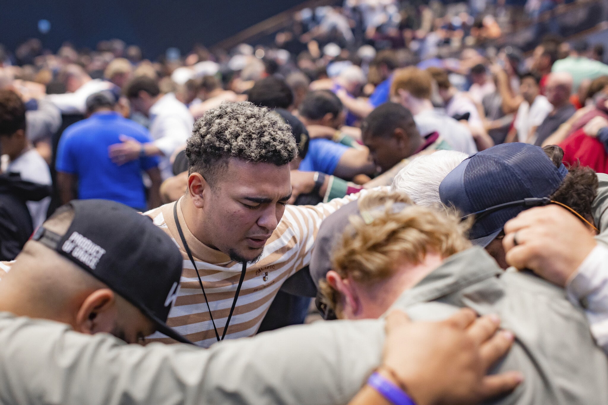 People standing around a woman in prayer